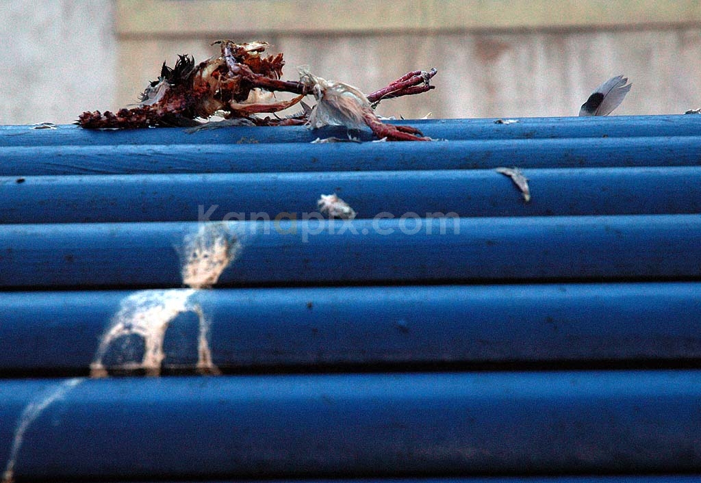 pigeon_mort carcasse de pigeon Date/Time: 2005:01:04 11:32:59 Un faucon crécerelle a profité du calme qui règne pendant les vacances scolaires pour attaquer un pigeon. Voici ce qu'il reste de sa dépouille.